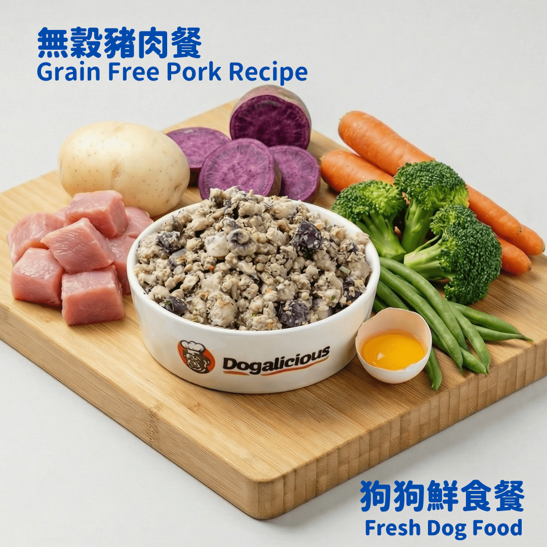 Ingredients: Lean pork, potato, sweet potato, egg, sunflower oil, carrot, broccoli, green bean, flaxseed oil, eggshell powder, Dogalicious nutrient blend, psyllium husk, pumpkin powder